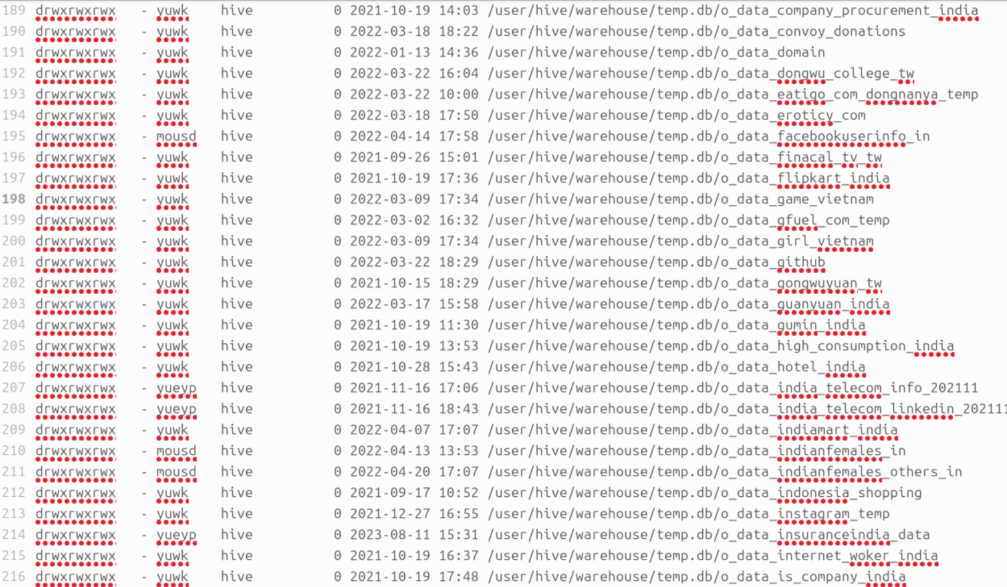 The exposed Knownsec archive includes extensive nation-state data, including a 95 GB compressed file comprising Indian immigration information and digital infrastructure maps. Other notable breaches included 3TB of South Korean telecom data and 459GB of Taiwanese road planning data. We also identified an Excel file containing a list of various data breaches along with the number of records and available data fields.
