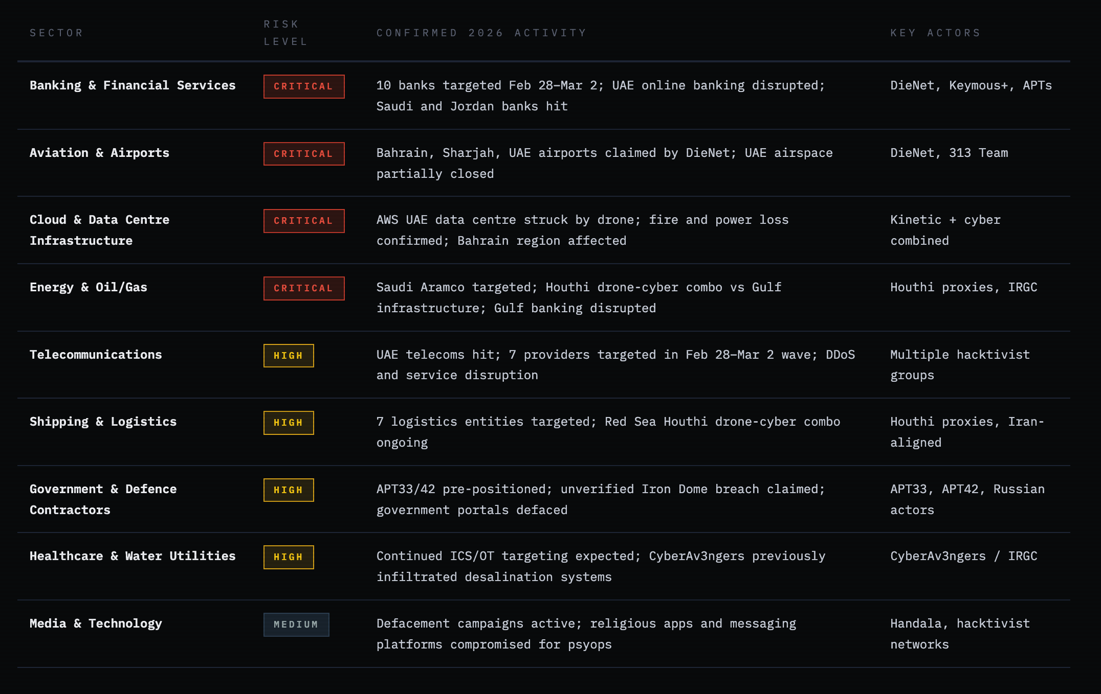 Over 150 hacktivist incidents recorded across open channels within 72 hours, hitting 110 organizations in 16 countries. Ten financial institutions were targeted in coordinated disruption attempts, including major banks in Saudi Arabia, Jordan, and Israel. DieNet claimed DDoS attacks on airports in Bahrain, Sharjah, and the UAE. Seven aviation and logistics entities, multiple government ministries, and telecoms providers were also targeted. UAE phone and online banking services experienced disruption, though most claims were not independently verified as deep system breaches.