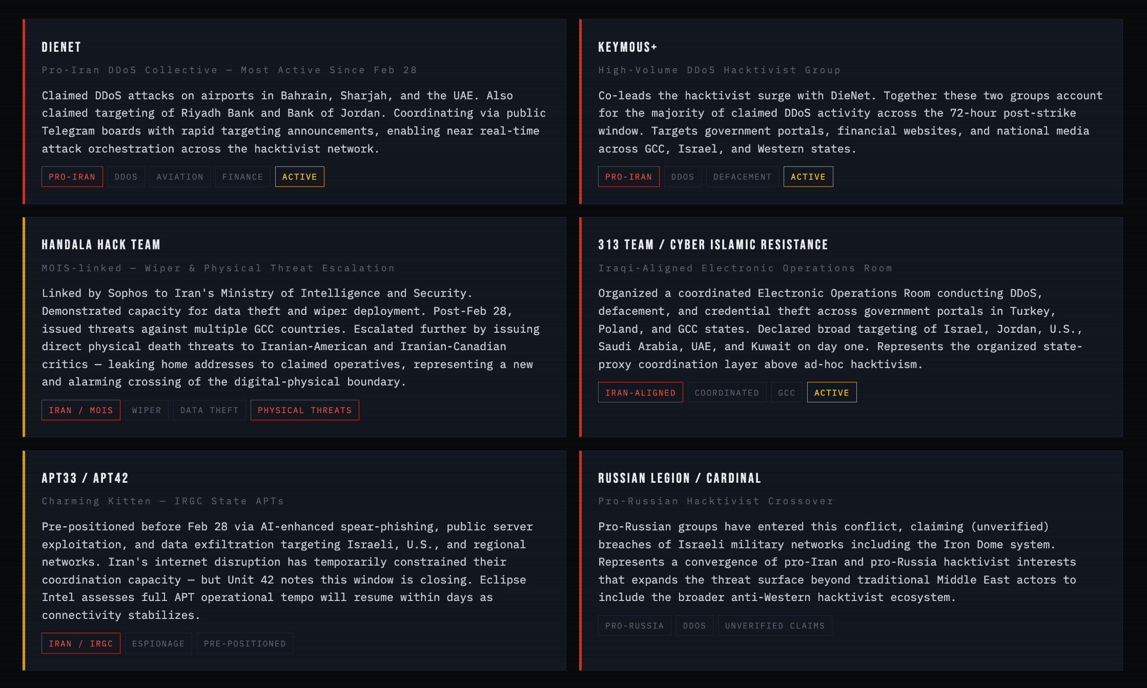 Eclipse Intel is tracking activity from over 70 groups activated since February 28. Keymous+ and DieNet alone drove nearly 70% of all hacktivist DDoS activity in the first four days, per Radware. Below are the key actors your security team must understand.